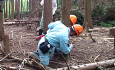 Tree thinning work was performed in a forest of Japanese cypress trees under the guidance of members from Chusei Forest Owners' Cooperative Forest Maintenance Section and Tsu City Agriculture, Forestry and Fisheries Department, Forestry Promotion Office. They first cut a slit using a saw and tied a rope around the tree to pull it down with the combined strength of the participants, although there were cases where they had difficulty getting the tree to fall in the desired direction.