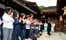 At the opening address, Mr. Sasaki, Manager of NTT West Kyoto Branch, expressed that it was extremely important not only for NTT West to reduce the company's environmental load, but also to engage actively in such hollyhock growing activities and other biodiversity conservation initiatives from the viewpoint of SDGs*. This was followed by a speech from Mr. Tanaka, Chief Priest of Kamigamo Shrine, who gave an interesting introduction to the history of the shrine and Aoi Festival. Also, participants visited the main shrine that is usually out of bounds to the public and had the opportunity to experience the sense of magnificence.