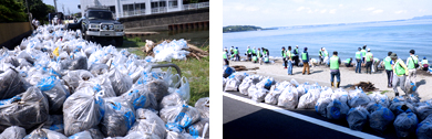 Combustible wastes, non-combustible wastes, as well as natural wastes (sea algae, wood debris, etc.) that were washed ashore were sorted accordingly during the cleaning activity. Natural wastes that were collected were particularly heavy as they contained a large amount of water, and it was a challenging task to transport them from one end of the beach to the other. There was concern at first that some participants might suffer from heatstroke, but nonetheless the cleaning activity ended smoothly, thanks to the cooperation of the participants.