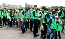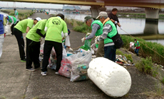 Under the cloudy sky on the day of the event, participants gathered at the center levee of river bank between Shonai River and Shinkawa River. They were split into three groups and walked to the respective cleaning areas.