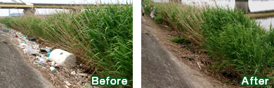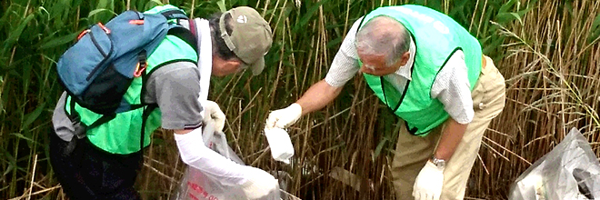 Upon arriving at the river bank, various kinds of litter including plastic bottles and empty cans were found scattered across the area. Garbage that drifted down from the upstream when the river level rose during the past typhoons was blocked by the reeds and built up.