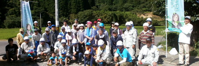 This is the third round of the activity that is held as a part of the corporate volunteer initiative based on the "Agreement on Rice Terrace Conservation Activities" that was concluded between Nakanotsuru Residents' Association and NTT West Saga Branch on July 10 last year. A total of 65 participants took part in this event, including 20 members from Nakanotsuru Residents' Association and 45 who are Saga Group employees and their family members.