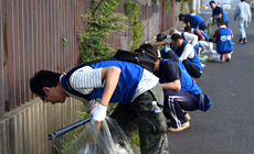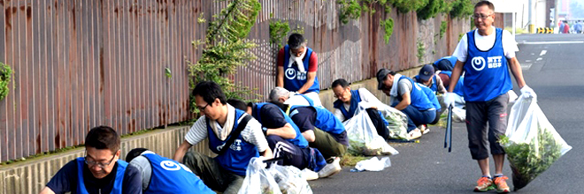 Wearing a blue bib vest printed with the NTT logo, participants carried a plastic bag in their hand and cooperated with the local residents to engage in picking up of litter and weeding for about an hour, even though they were drenched in sweat under the sun.