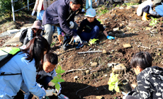 Participants paid careful attention to stand firmly while working on the slope, and completed planting about 200 rhododendron, hydrangea and sawtooth oak saplings in about an hour's time.