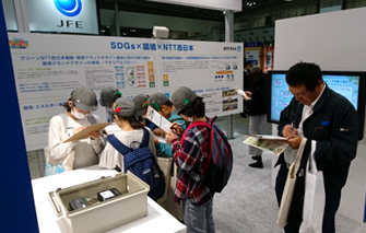 Under the main theme of "SDGs x Environment x NTT West," NTT West Group exhibited on the "Solution Environment Label," Eco Megane" as well as SDG initiatives including "Our Efforts to Achieve the Green NTT West Strategy and Environment Grand Design Goal and Achievement of the Environment Grand Design - Material Flow," "Our Efforts toward Power Reduction - Introduction of Smart DASH (mini DASH) for Small Machine Rooms," "Development of Environment and Energy Businesses - Eco Houses Using HEMS Hikari BOX+" and "Promotion of Biodiversity Conservation Initiatives - Outline of Midori Ippai Activities."