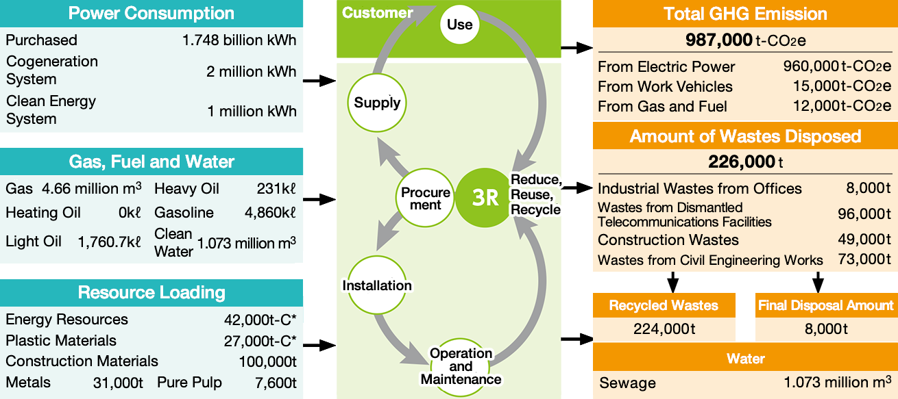 For example, to enable voice calls between our customers, networks such as telephones, switching equipment as well as communication cables installed throughout western Japan are required, and business activities related to these, such as logistics, works, operation, servicing and provision of products, impose a heavy load on the environment.