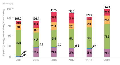 Environmental conservation (economic) effects for FY2019 reached 14.43 billion yen, which exceeded the result of the previous fiscal year.