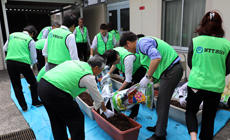 Under the hot weather on the day of the event, a total of 55 participants, including employees and family members of Gifu Group, engaged in activities from repairing of racks for the "green curtains" to weeding of the flowerbeds, changing of the soil in the planters and planting of seedlings.
