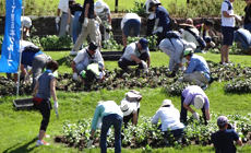 Members of Tokai Group proceeded to the flowerbeds at the "Flower Field Observatory and Resting Area" where they planted a large number of seedlings that suited the season.