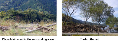 Amidst global warming, which has been regarded as an issue in recent years, there were many typhoons that approached or hit the area this year, which caused an even larger quantity of driftwood of all sizes to be washed ashore than before. This resulted in pollution of the river and local environments, devastation of mountain forests, and even a drastic decrease in the catch of sakura shrimps and shirasu fish, which are the famous specialties of Suruga Bay.