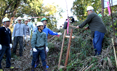 A total of about 80 participants, including employees and family members of Kagawa Group, took part in the activity. With support from members of Shionoe-cho Forest Owners' Cooperative, participants carried out forest maintenance work to protect and grow the trees, including setting up poles to promote growth of the yamazakura cherries that were planted about five years ago and planting new saplings at areas where the plants had withered.