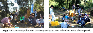 In conjunction with the planting work, a hands-on workshop to make piggy banks using the felled bamboos was also held for the large number of children participants. It was heart-warming to see them enjoying the process of drawing their own original pictures on the bamboos during the waiting time.
