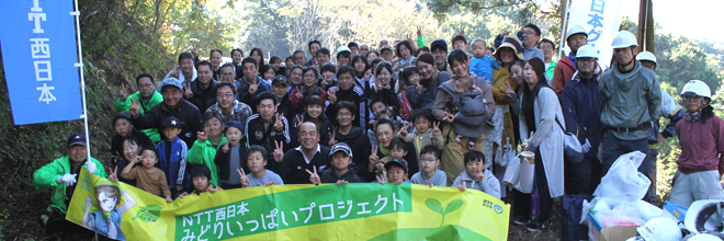 HOME  About NTT WEST(Corporate Data)  Sustainability Report  Annual Environmental Report 2020  Midori Ippai Project Activities 2019 LINE 370 6th "NTT Midori Ippai Shionoe no Mori" Tree-planting Activity