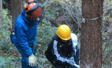 The hands-on tree-thinning workshop was held on a slightly steep slope. Under the guidance of members of the Kochi Forest Owners' Cooperative, participants including children and adults worked together to cut down four Japanese cedar trees with a diameter of about 30cm using saws.