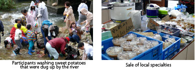 After work was completed, food including steamed sweet potatoes, shishi-jiru (wild boar miso soup) and rice balls made from new rice harvested from the rice terrace were offered by the local residents at the community center, where participants deepened their interaction while enjoying the delicious meal.