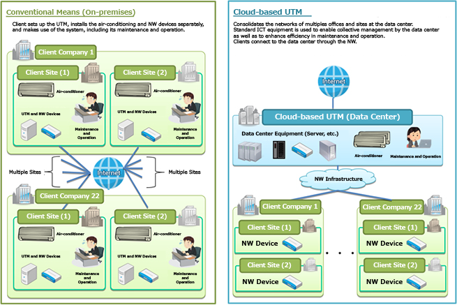 Cloud-based UTM helps to consolidate the networks of clients at multiples offices and sites to the data center for security measures to be implemented at a low cost and to achieve efficient operation. By installing a UTM device at the respective sites, it is possible to consolidate the individual Internet connections to the cloud-based UTM, thereby allowing the same security settings for the on-premises environment to be applied on the cloud. Meanwhile, unifying the security settings and management for each site on the cloud-based UTM also helps to ensure efficient operation. This service significantly reduces the number of ICT equipment to be installed, thus contributing to CO2 reduction. Results have shown that introduction of Cloud-based UTM has helped to lower CO2 emissions by 42% yearly compared to conventional means.