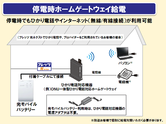 停電時にひかり電話対応機器(ホームゲートウェイ)と本商品をつなげば※2、「ひかり電話」(IP電話サービス)やインターネットの利用が可能※3