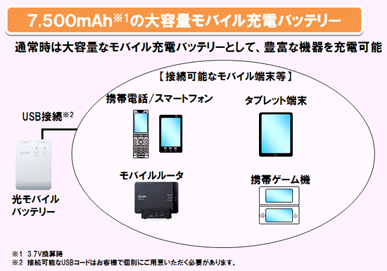 - モバイル端末への給電機能とひかり電話対応機器(ホームゲートウェイ)への給電機能の両方を具備したモバイルバッテリー