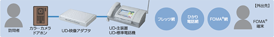 ドアホンとUD-映像アダプタ、UD-主装置をつなげば、留守中の来客にも、外出先からFOMA