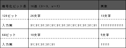WEPキーは16進または英数形式で入力します。(下記対応表参照)