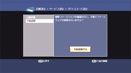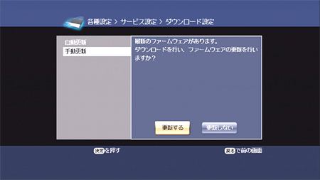 お客様が「各種設定」の「サービス設定」「ダウンロード設定」にて自動更新機能を「自動更新しない」に設定している場合は、手動でファームウェアの更新を行ってください。