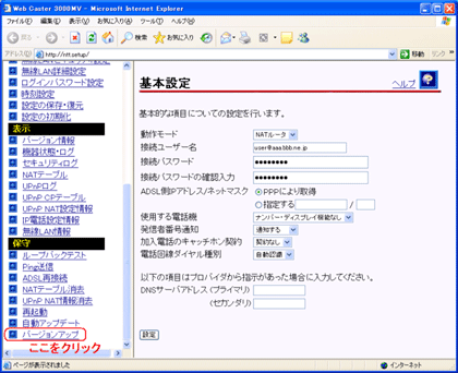 - 設定メニュー画面が表示されましたら、設定画面のメニューフレーム「保守」の「バージョンアップ」をクリックします。