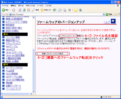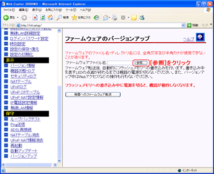 - 画面右側の操作フレームにある【ファームウェアのバージョンアップ】にて「参照」をクリックします。