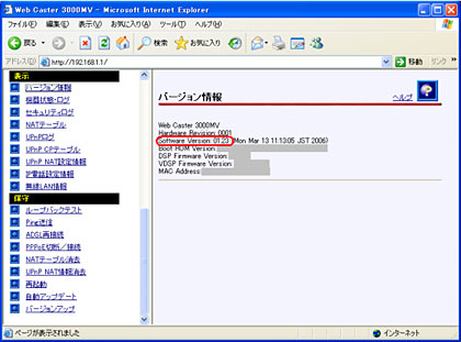 - 設定画面のメニューフレーム「表示」の「バージョン情報」をクリックして、バージョンを確認してください。