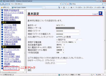 - 設定メニュー画面が表示されましたら、設定画面のメニューフレーム「保守」の「バージョンアップ」をクリックします。