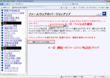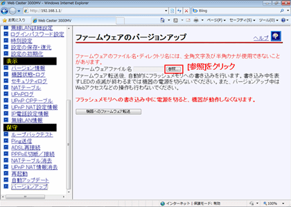 - 画面右側の操作フレームにある【ファームウェアのバージョンアップ】にて「参照」をクリックします。