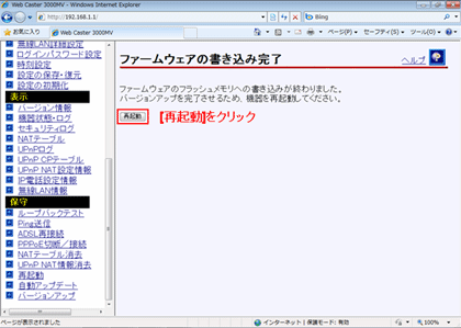 - 「再起動」をクリックします。新しいファームウェアで再起動します。アラームランプの点滅が終了したら、再起動の終了となります。