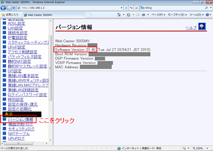 - 設定画面のメニューフレーム「表示」の「バージョン情報」をクリックして、バージョンを確認してください。