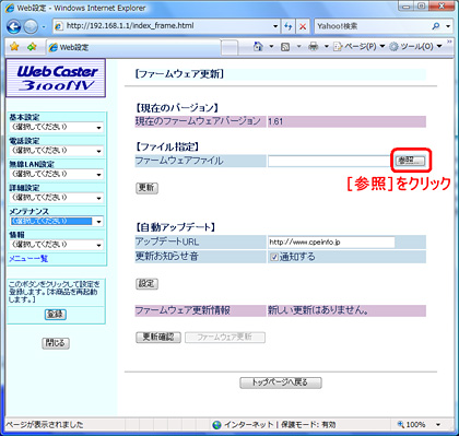 - 【ファイル指定】の「ファームウェアファイル」で[参照]をクリックます。
