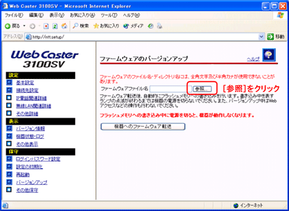 - 画面右側の操作フレームにある【ファームウェアのバージョンアップ】にて「参照」をクリックします。