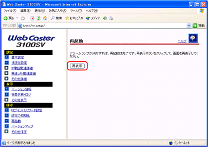 - アラームランプが消灯すれば、再起動は完了です。[再表示]ボタンをクリックしてください。