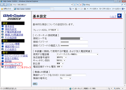 - 設定メニュー画面が表示されましたら、設定画面のメニューフレーム「保守」の「バージョンアップ」をクリックします。