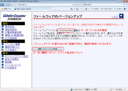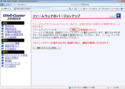 - 画面右側の操作フレームにある【ファームウェアのバージョンアップ】にて「参照」をクリックします。