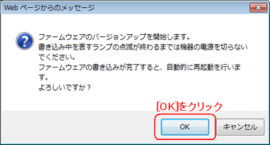 - バージョンアップ開始後、完了するまで絶対に装置本体の電源を落とさないでください。途中で電源を落としますと装置本体のファームウェアが破壊され、復旧不可能な状態となる場合がございます。