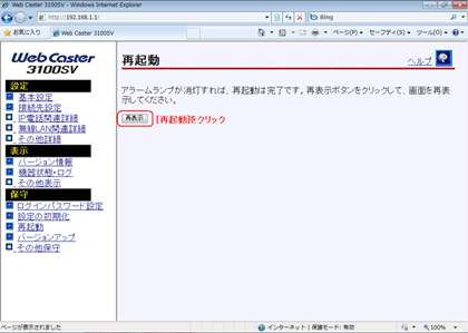 - アラームランプが消灯すれば、再起動は完了です。[再表示]ボタンをクリックしてください。