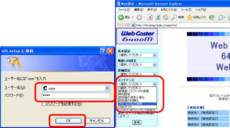- ユーザ名/パスワードの入力画面が表示されたら、ユーザ名には「user」と入力してください。パスワードには「お客様が設定されたパスワード」を入力してください。