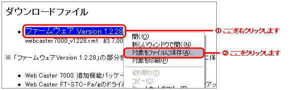 ※ 「ファームウェアVersion 1.2.28」の部分を右クリックし、「対象をファイルに保存」等を選択してダウンロードしてください。