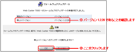 1.2.28で動作するWeb Caster 7000に、Version 1.1.2以前のファームウェアをインストールしないでください。ルータが起動できなくなり、使用できなくなる場合があります。