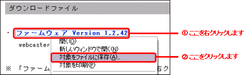 ※ 「ファームウェア Version 1.2.42」の部分を右クリックし、「対象をファイルに保存」等を選択してダウンロードしてください。