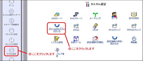 [カスタム設定]画面から[ファームウェアアップデート]ボタンをクリックします。