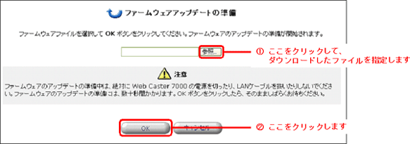 - [参照]ボタンをクリックして、ダウンロードしたファームウェアのファイルを選択し、[OK]ボタンをクリックします。