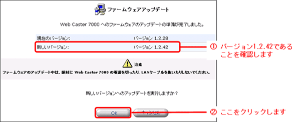 - ファームウェアアップデートを確認する画面に切り替わりますので、新しいバージョンが 1.2.42であることを確認して、[OK]ボタンをクリックします。ファームウェアのアップデートが開始されます。完了すると、自動的に本商品が再起動されます。