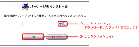 4. [パッケージのインストール]画面で、[参照]ボタンをクリックして、ダウンロードした追加機能パッケージのファイルを選択し、[OK]ボタンをクリックします。