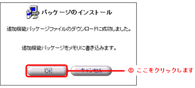 5. [パッケージのインストール]画面で、[OK]ボタンをクリックします。追加機能パッケージのメモリへの書き込みが開始され、しばらくすると、次の(6.)の[追加機能パッケージ]画面に自動的に移ります。