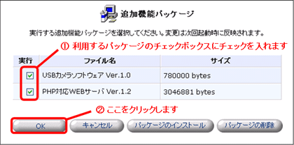 ここでは、Web Caster 800 追加機能パッケージのインストール方法について説明します。PHP対応WEBサーバまたはUSBカメラサーバをご利用になる場合は、以下の方法に従ってインストールをしてください。