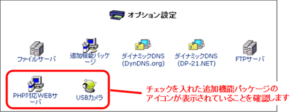 7. [オプション設定]画面で、(6.)でチェックを入れた追加機能パッケージのアイコン(「PHP対応WEBサーバ」または「USBカメラ」)が表示されていることを確認します。